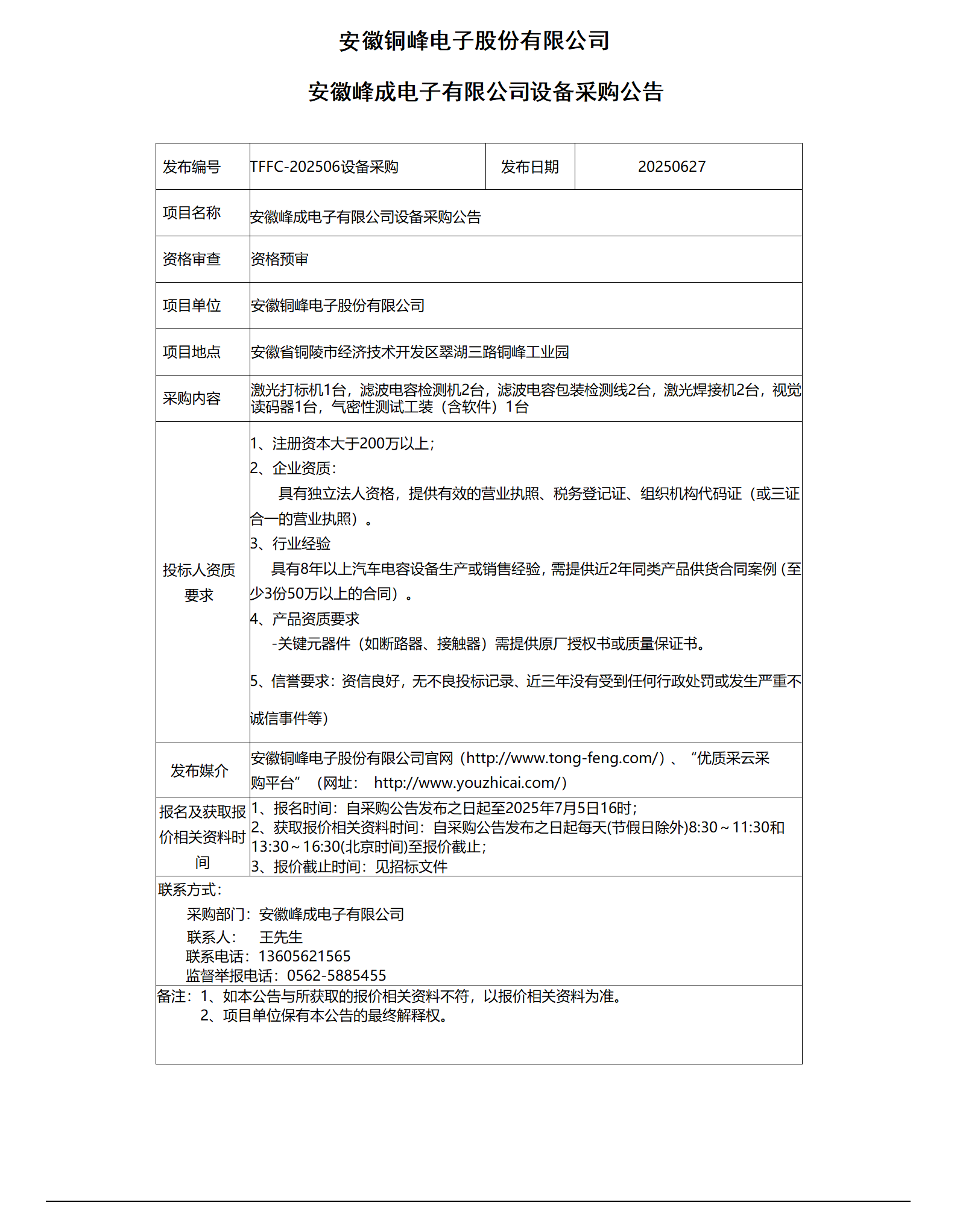 安徽峰成电子有限公司设备采购公告_01