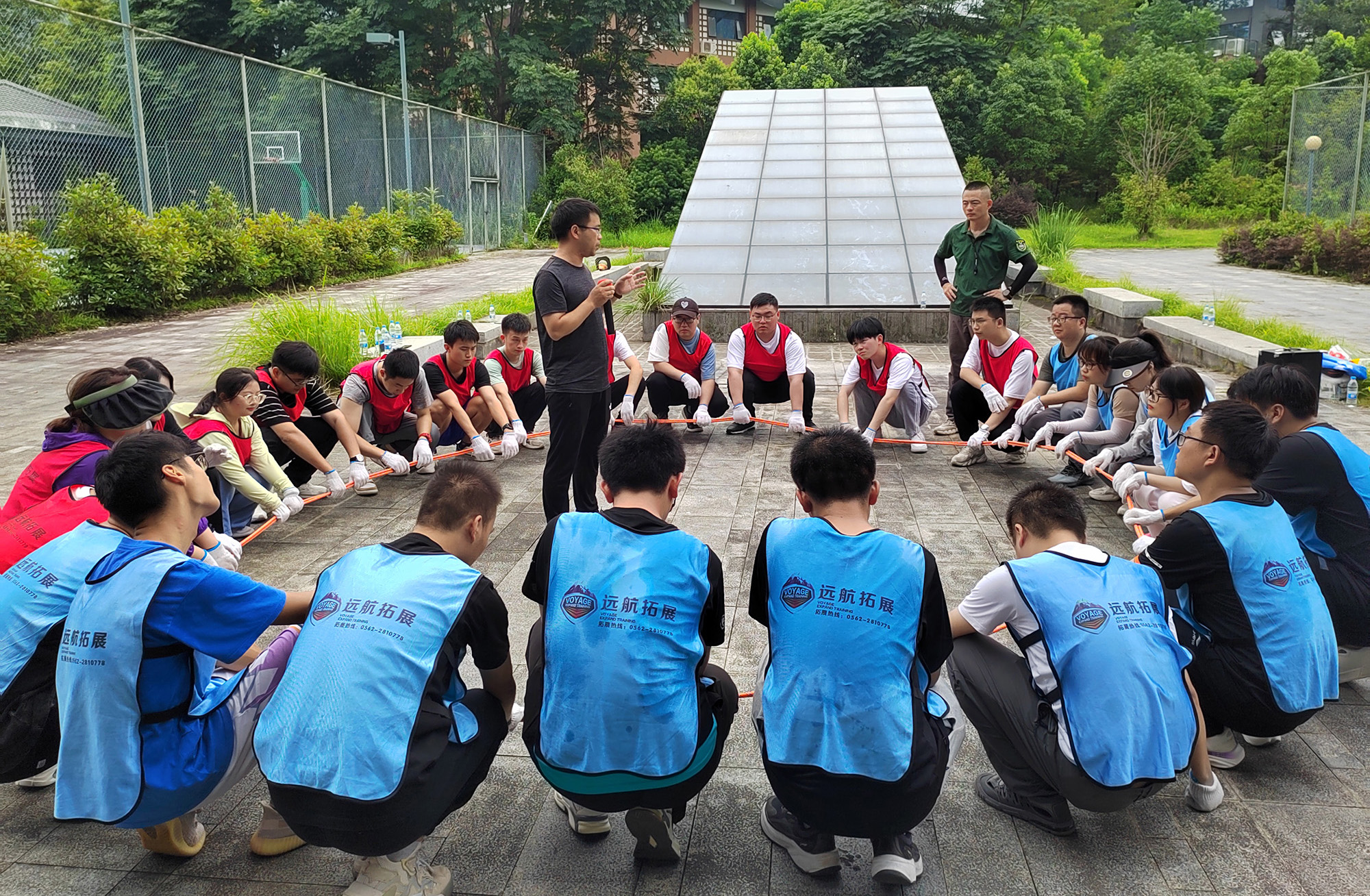 拓展培训活动在教练的专业指导下有序进行:新入职大学生分为2个小组,由组长牵头合作创建了属于自己的团队,为各自的团队设计队名、队歌、队旗及口号,并共同完成疯狂市场、急速60秒、双解码及生命动力圈等一系列活动。