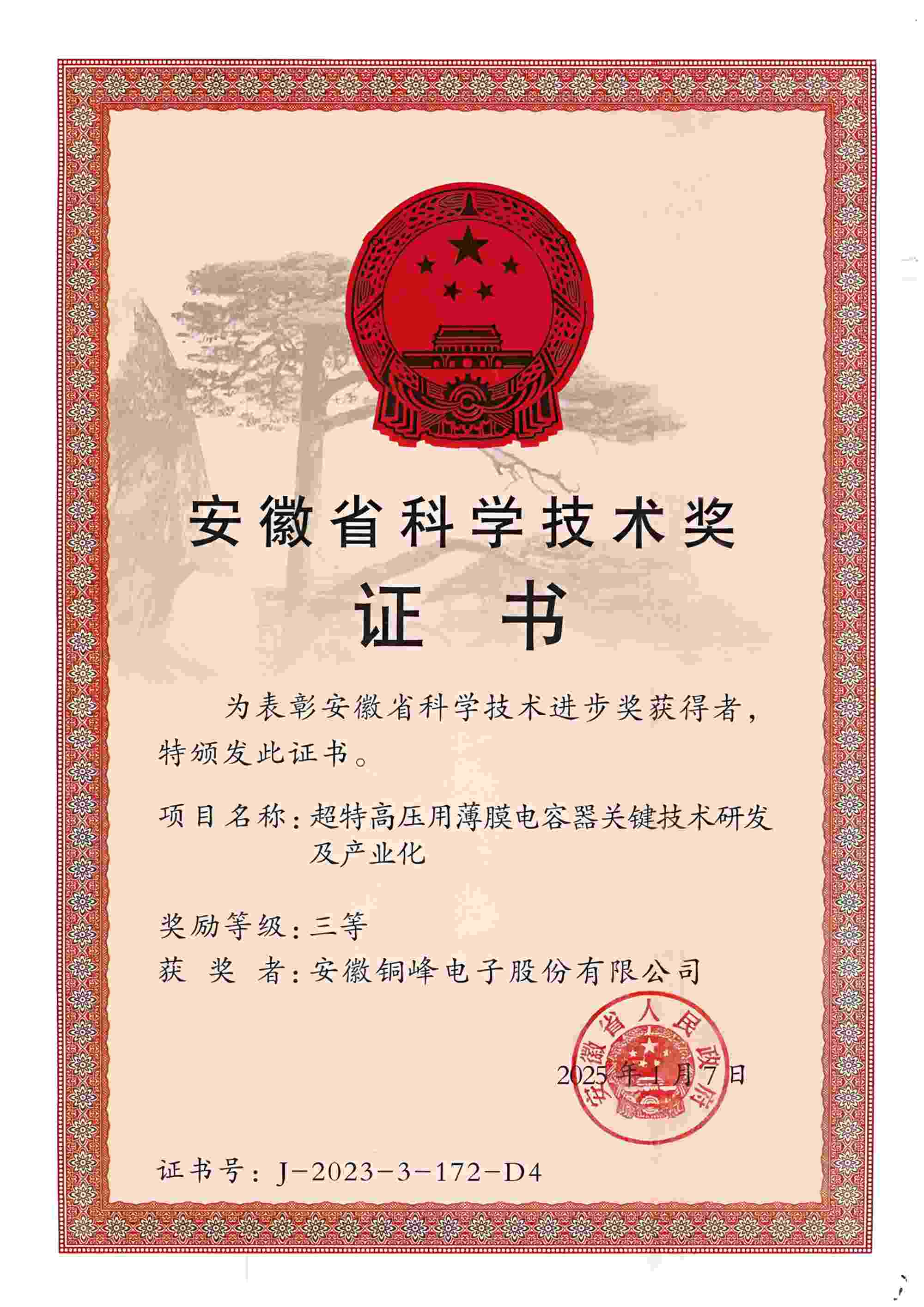 5月12日上午,安徽省科技创新大会召开,隆重表彰2023年度安徽省科学技术奖励获奖人员和组织。公司与国网安徽省电力有限公司、国网智能电网研究院有限公司、西安交通大学等单位联合完成的“超特高压用薄膜电容器关键技术研发及产业化项目”荣获安徽省科技进步三等奖。