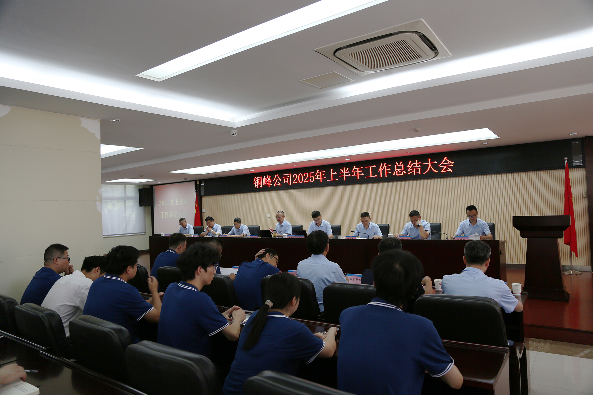 8月8日下午,公司在办公楼二楼职教室隆重召开2025年上半年工作总结大会。公司党政领导班子成员、各生产经营单位车间主任和职能部门主管级以上人员、部分职工代表和新进大学生代表等参加会议。会议认真复盘上半年运营成果,深入分析当前经营形势,精心谋划下半年重点工作。公司党委书记、董事长黄明强出席会议并作总结讲话,对公司上半年工作进行总体分析,对下半年工作提出要求。总经理鲍俊华主持会议,并对公司各单位和部门的具体工作进行点评。公司各生产单位和相关职能部门分别汇报了上半年主要工作及下半年工作计划。