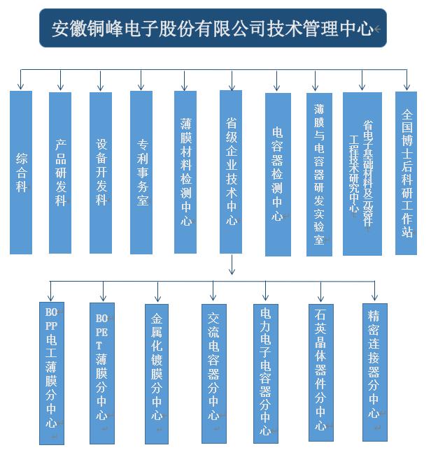 铜峰公司为国家高新技术企业、国家火炬计划重点高新技术企业、国家火炬计划铜陵电子材料产业基地重点骨干企业。公司建有完整的科研创新组织体系,设立技术管理中心作为技术研发的总管理机构,组织协调公司的各分子公司和相关部门,以确保公司技术创新精确高效地运行。技术管理中心下设综合科、产品研发科、设备开发科、专利事务室、薄膜材料检测中心、电容器检测中心以及薄膜与电容器研发实验室,同时下设省级企业技术中心、安徽省电子基础材料及元器件工程技术研究中心以及国家级博士后科研工作站。